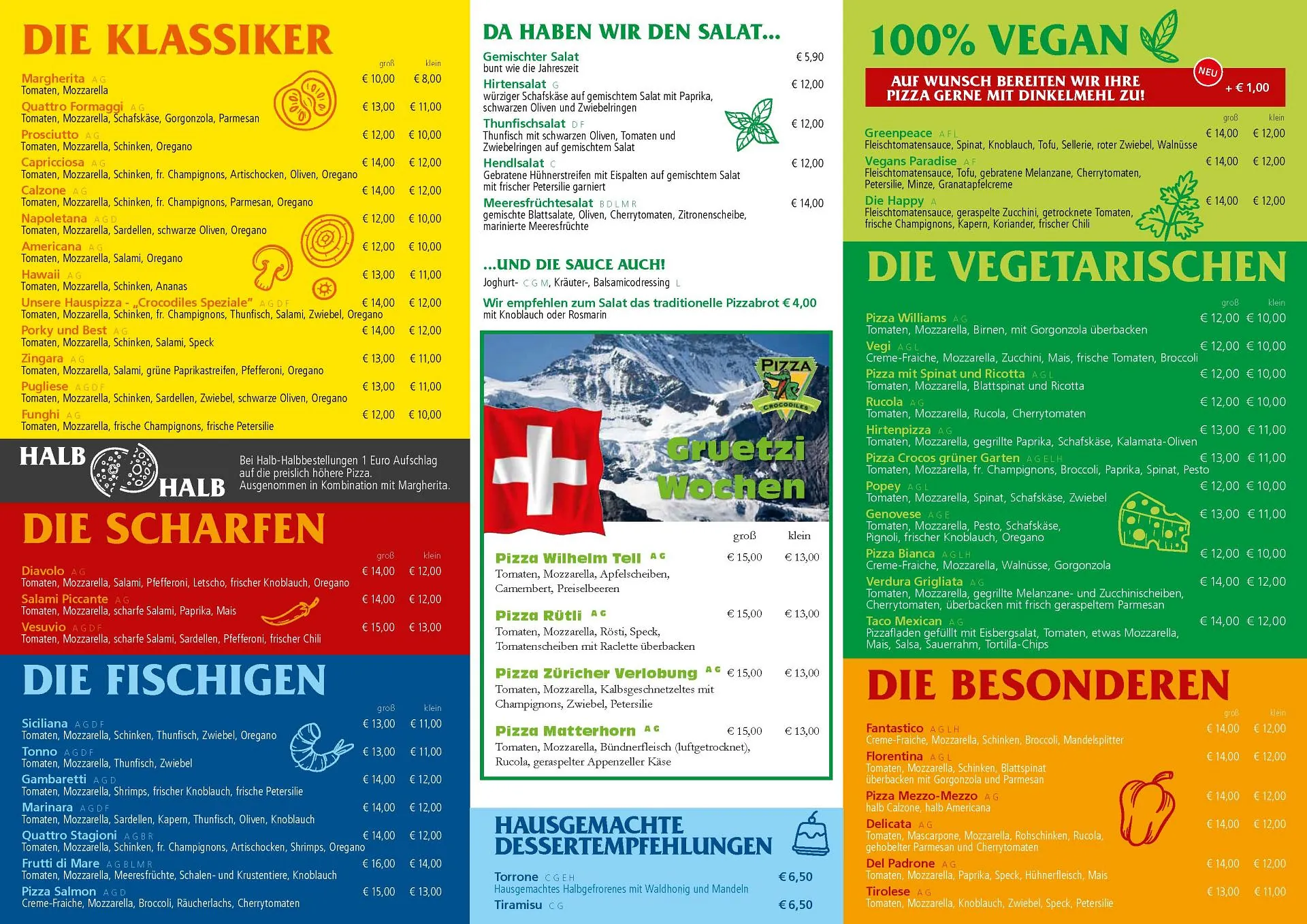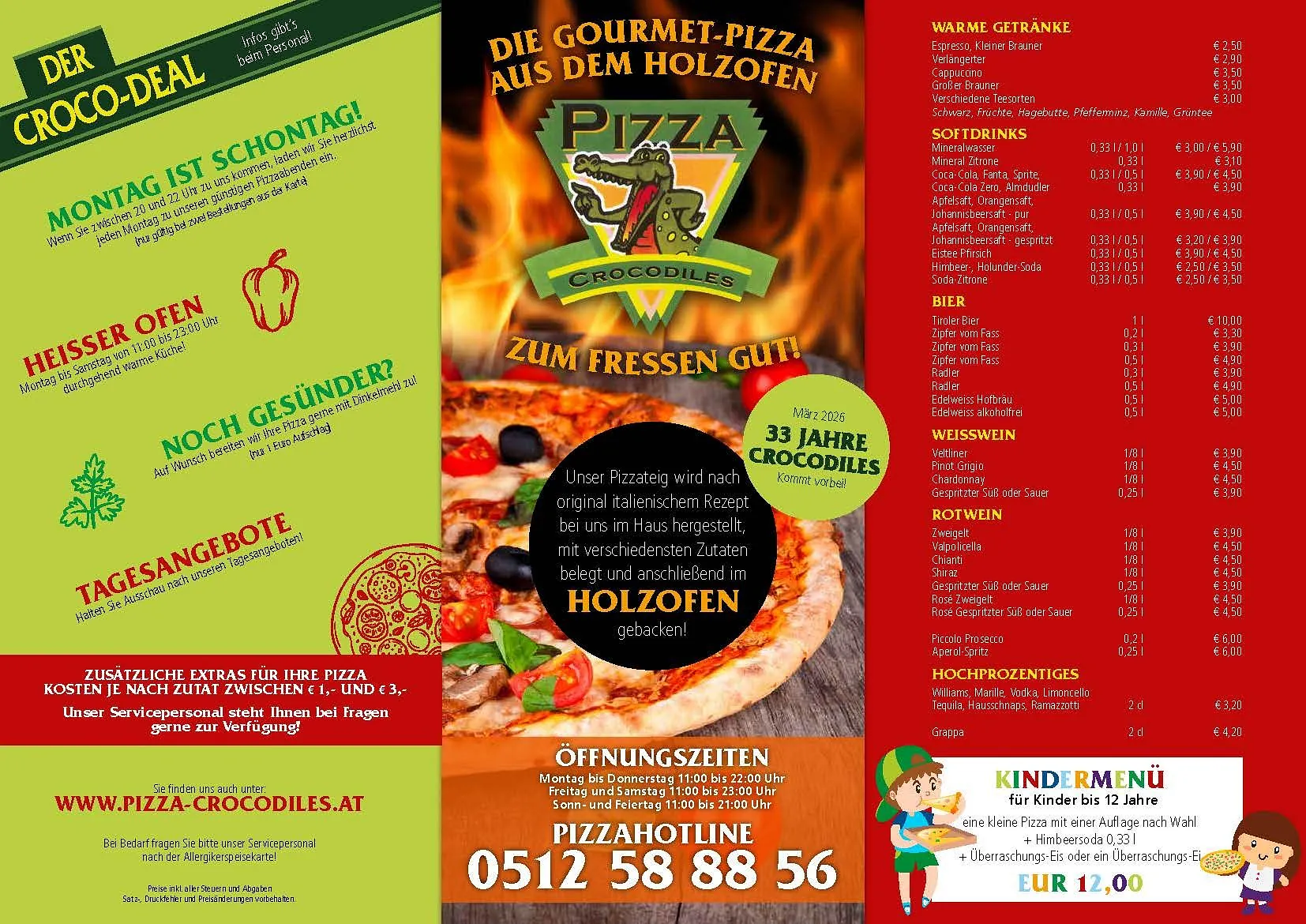 Montag ist Schontag: Zwischen 20.00 und 23.00 Uhr genießen Sie alle Pizzen zum Preis einer Pizza Margherita – ein echtes Highlight für Genießer. Dieses Angebot gilt jeden Montag ausschließlich für Bestellungen vor Ort im Restaurant, nicht für Take-away. Perfekt, um sich den Wochenstart kulinarisch zu versüßen! Beim Croco-Deal sammeln Sie mit jeder Pizza einen Stempel. Nach 12 Stempeln gibt’s eine Pizza gratis – „zum Fressen gut!“ Für die Kleinen gibt’s ein Kindermenü für Kinder bis 12 Jahre.